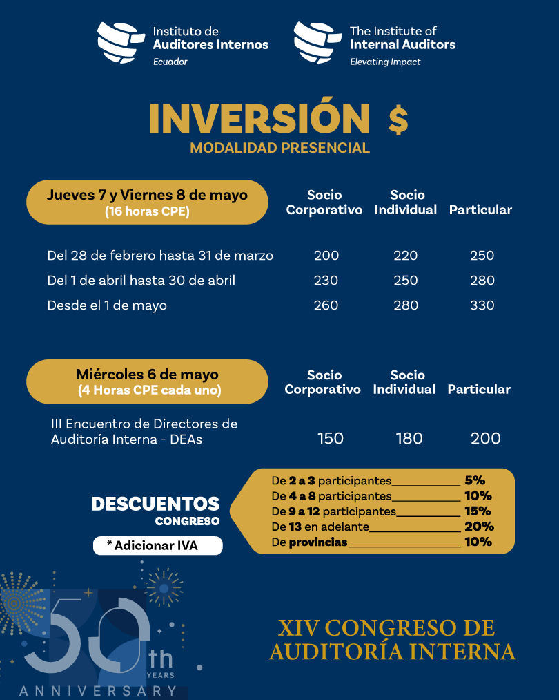 Contaremos con la participación de expertos en inteligencia artificial, ciberseguridad, ESG, auditoría forense, y otras tendencias clave que te permitirán liderar el cambio en tu organización, elevando la eficacia, ética e impacto de la auditoría interna.